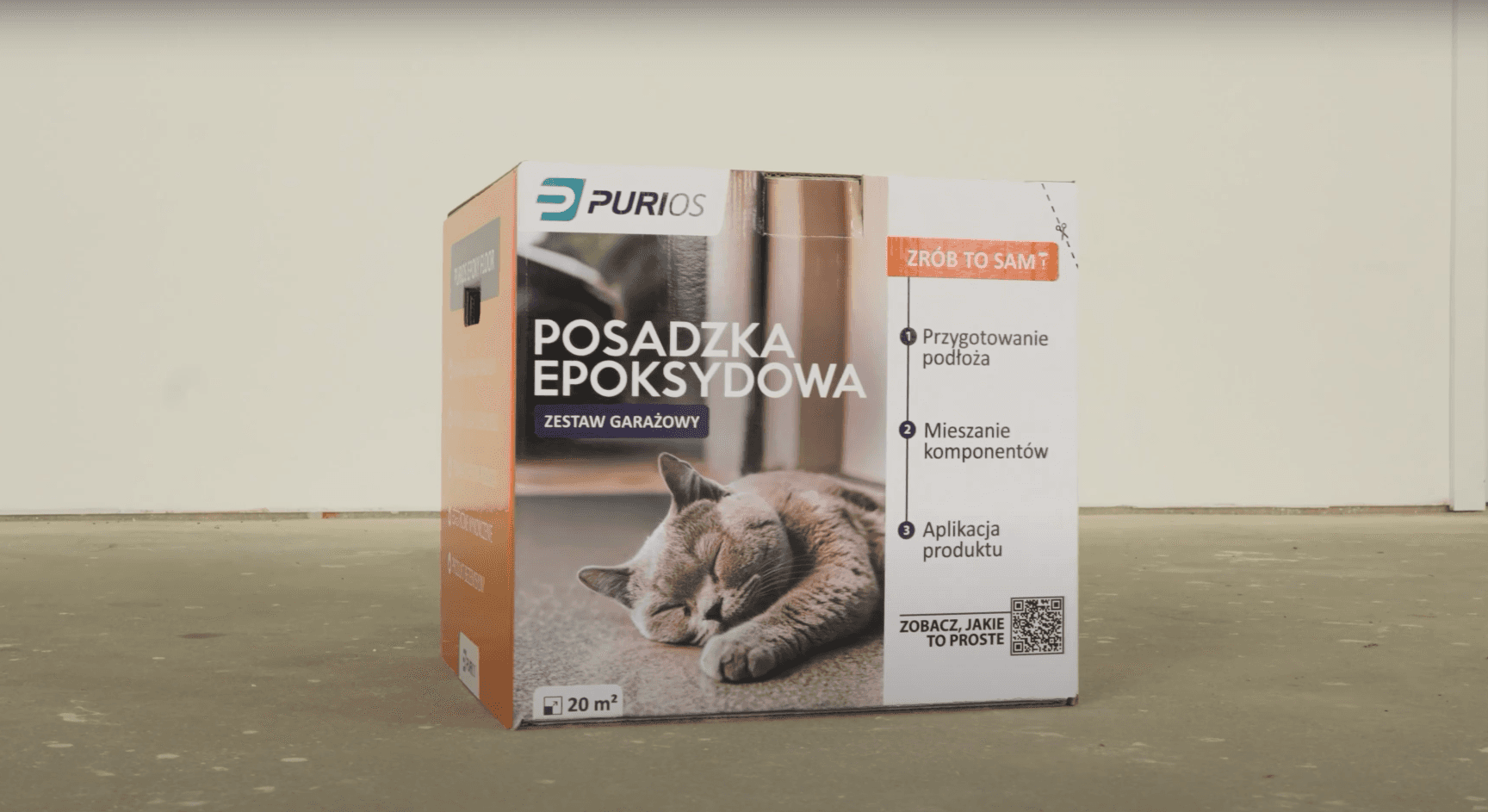 Opakowanie zostało zaprojektowane tak, aby wyróżniało się wizualnie na tle klasycznych zestawów budowlanych. Stonowana, spójna kolorystyka i proste rozwiązania graficzne zapewniają czytelność, a kod QR na froncie i górze opakowania prowadzi do filmu instruktażowego z aplikacji zestawu. Na pudełku wyraźnie zaznaczono, że jest to produkt „Zrób to sam”, przedstawiono dokładną zawartość zestawu oraz kluczowe zalety posadzki epoksydowej. Całość została odpowiednio obrandowana, tak aby z każdej strony, niezależnie od ustawienia w magazynie czy sklepie, było wiadomo, że jest to produkt firmy Purios.