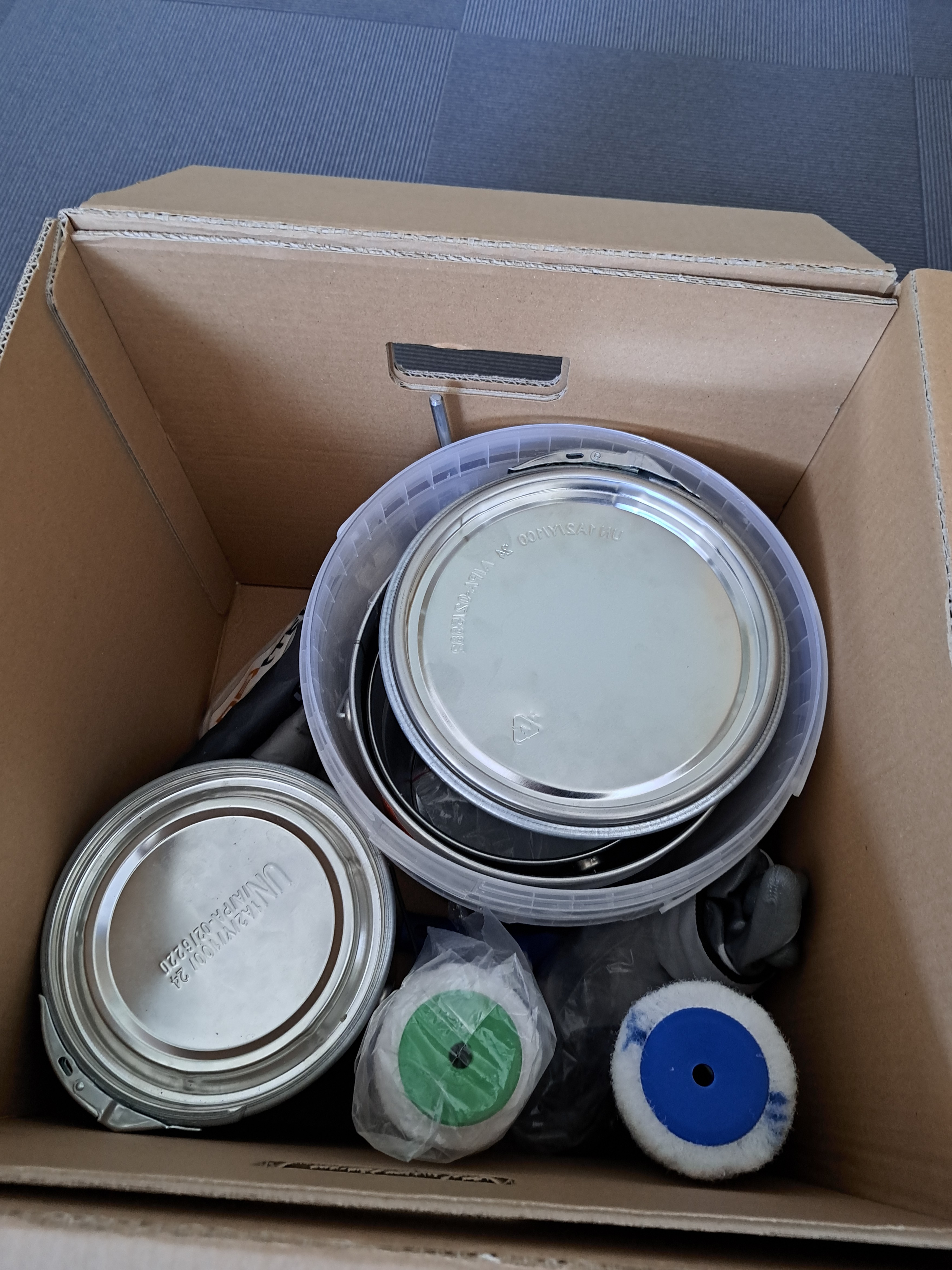 Komponenty zestawu zostały jasno oznaczone jako A (epoksyd) i B (utwardzacz). Duże litery A i B widoczne są zarówno na puszkach, jak i na wiadrze do mieszania. Dzięki temu użytkownik nie ma możliwości pomylenia kolejności – zgodnie z instrukcją utwardzacz zawsze należy wlać do wcześniej odmierzonej porcji epoksydu. Takie oznaczenie sprawia, że proces jest prosty, intuicyjny i bezpieczny.
