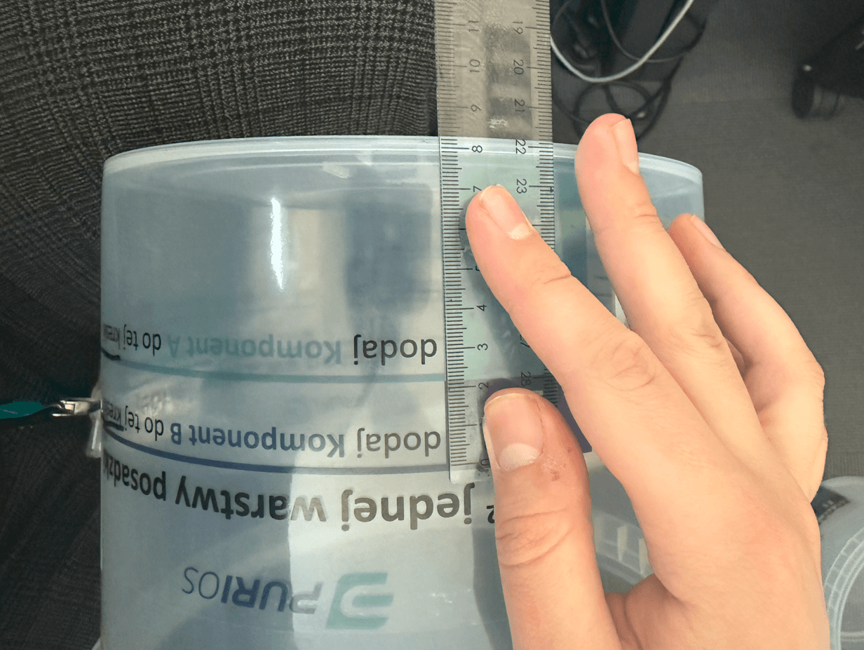 Wiadra do mieszania zostały wykonane z transparentnego tworzywa i wyposażone w specjalnie zaprojektowaną podziałkę. Skala wskazuje osobno poziomy dla komponentu A i B, a dodatkowo umożliwia odmierzanie objętości w litrach, co zwiększa wygodę i elastyczność użytkowania. Podziałka została nadrukowana na transparentnej naklejce, której projekt wymagał uwzględnienia stożkowego kształtu wiadra. Aby zachować maksymalną dokładność pomiarów, wysokości i proporcje skali były opracowywane we współpracy z działem technologicznym.