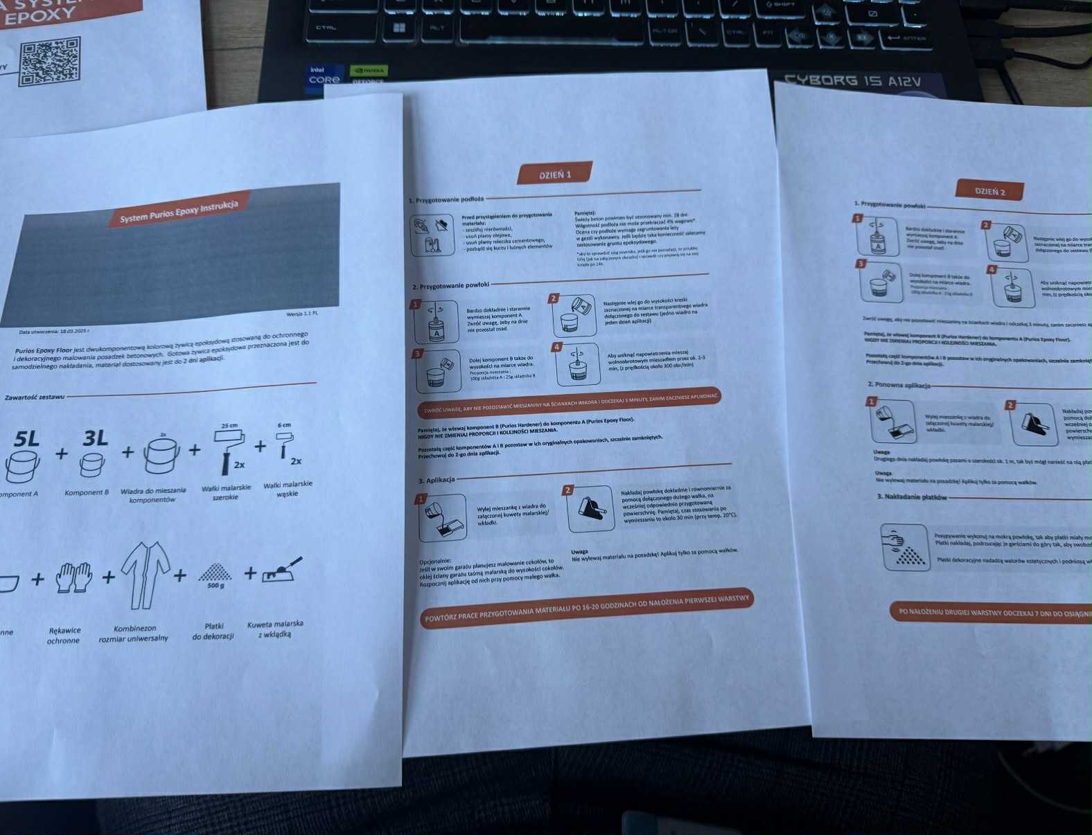 Każdy element zestawu, od żywicy po narzędzia, jest zawarty w jednym opakowaniu. Instrukcje krok po kroku prowadzą użytkownika przez cały proces, pozwalając na wykonanie posadzki w ciągu dwóch dni, bez konieczności korzystania z pomocy fachowców. Kluczowe było by całość była intuicyjna i prosta dla Usera, dlatego zaproponowałem dodanie skróconej wersji instrukcji wraz z kodem QR do filmu instruktażowego, która ukazuje się zaraz po otwarciu opakowania.