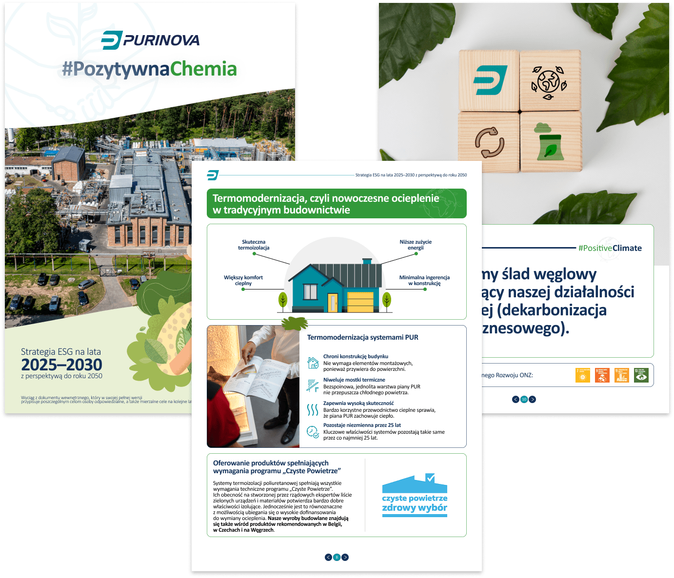 Kompleksowe opracowanie wizualne strategii ESG – od koncepcji graficznej, przez system identyfikacji, po spójny układ materiałów prezentacyjnych. Projekt miał na celu przejrzyste i atrakcyjne przedstawienie kluczowych obszarów zrównoważonego rozwoju oraz wzmocnienie komunikacji odpowiedzialności społecznej marki.