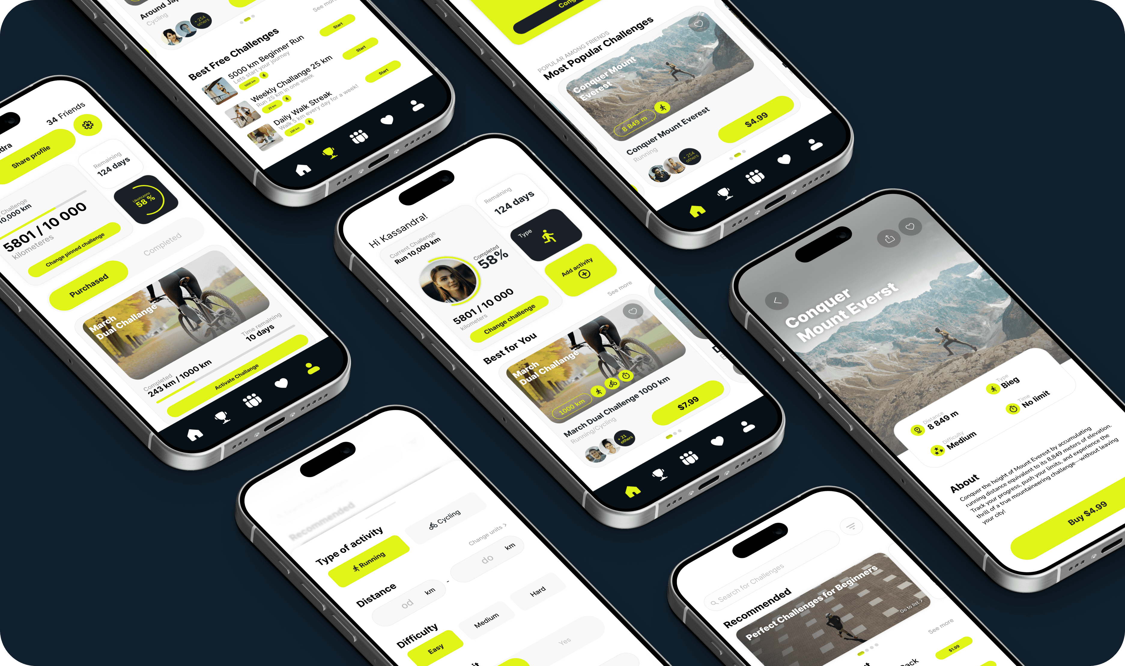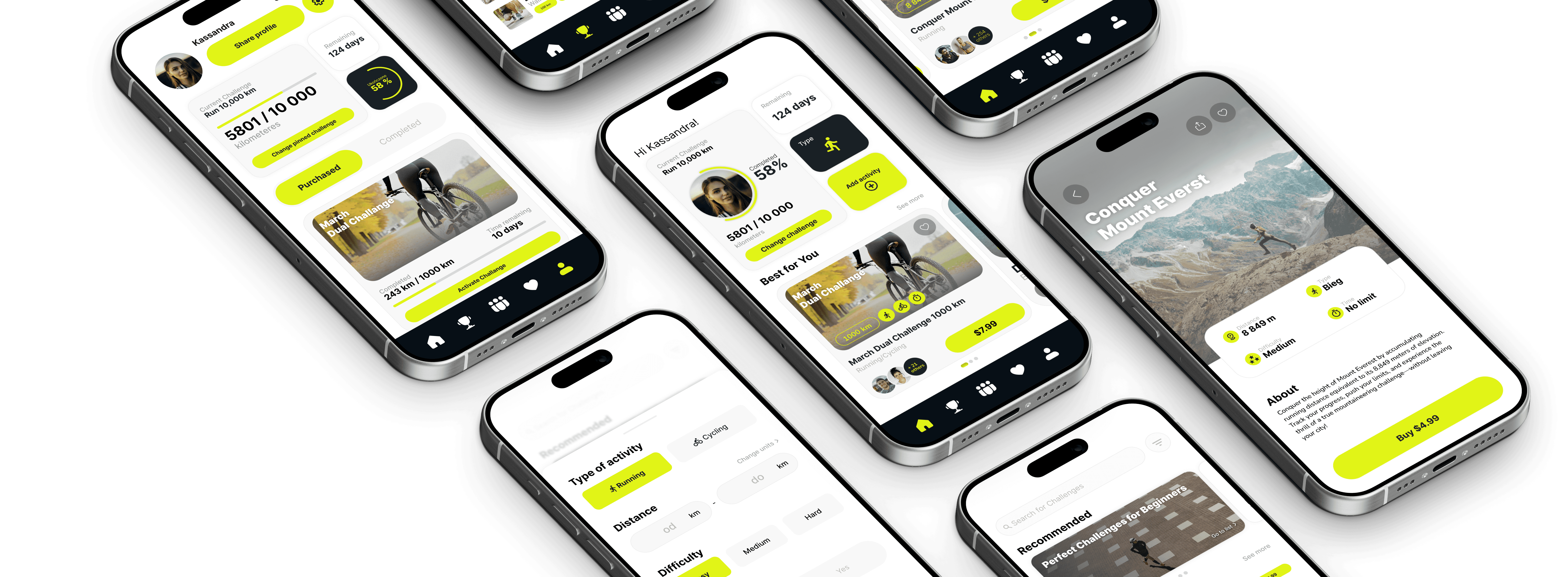 Projektowanie interfejsu aplikacji Milestone koncentrowało się na stworzeniu czytelnego, estetycznego i intuicyjnego doświadczenia dla użytkowników mobilnych. Każdy ekran został zaprojektowany tak, aby wspierać motywację do aktywności fizycznej – od dashboardu pokazującego postępy i statystyki, przez ekran wyzwań z jasnym podziałem na poziomy trudności, po sekcję społecznościową, w której użytkownicy mogą dzielić się wynikami i rywalizować ze znajomymi. Podczas projektowania UI zwracałem uwagę na hierarchię informacji, tak aby najważniejsze elementy były zawsze dobrze widoczne i łatwo dostępne. Kolorystyka i typografia zostały dobrane tak, by zarówno przyciągać uwagę, jak i nie męczyć wzroku przy dłuższym korzystaniu z aplikacji. Ikony i elementy interaktywne zostały zaprojektowane spójnie z brandingiem, a animacje postępów i osiągnięć wprowadzają dodatkowy element motywacyjny. Zadbano o spójne doświadczenie na różnych rozmiarach ekranów telefonów, aby interfejs był czytelny i wygodny w użyciu zarówno na mniejszych, jak i większych smartfonach.