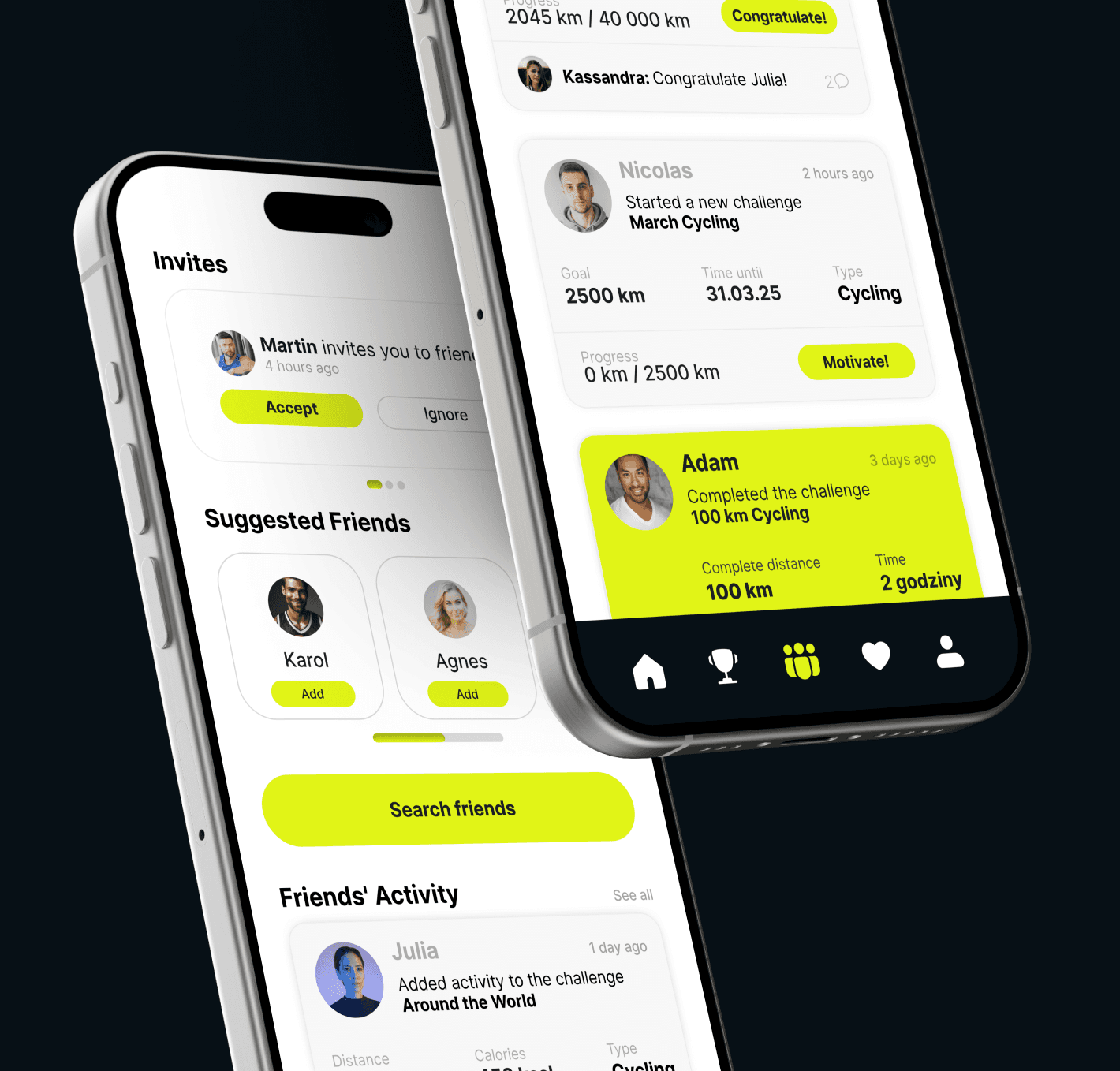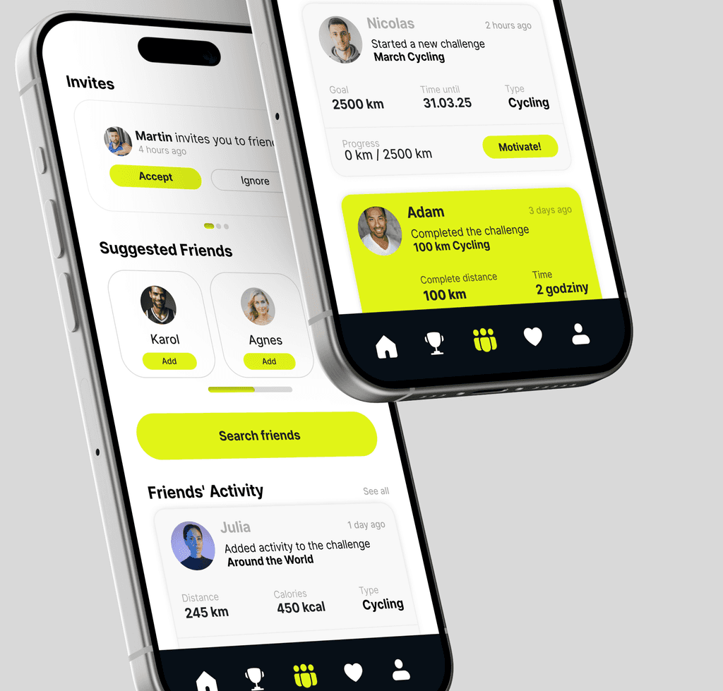 Wprowadziłem system wyzwań sportowych z nagrodami i postępami wizualizowanymi w formie odznak oraz statystyk. Dzięki temu użytkownik widzi efekty swoich działań i ma dodatkowy bodziec w postaci rywalizacji ze znajomymi.
