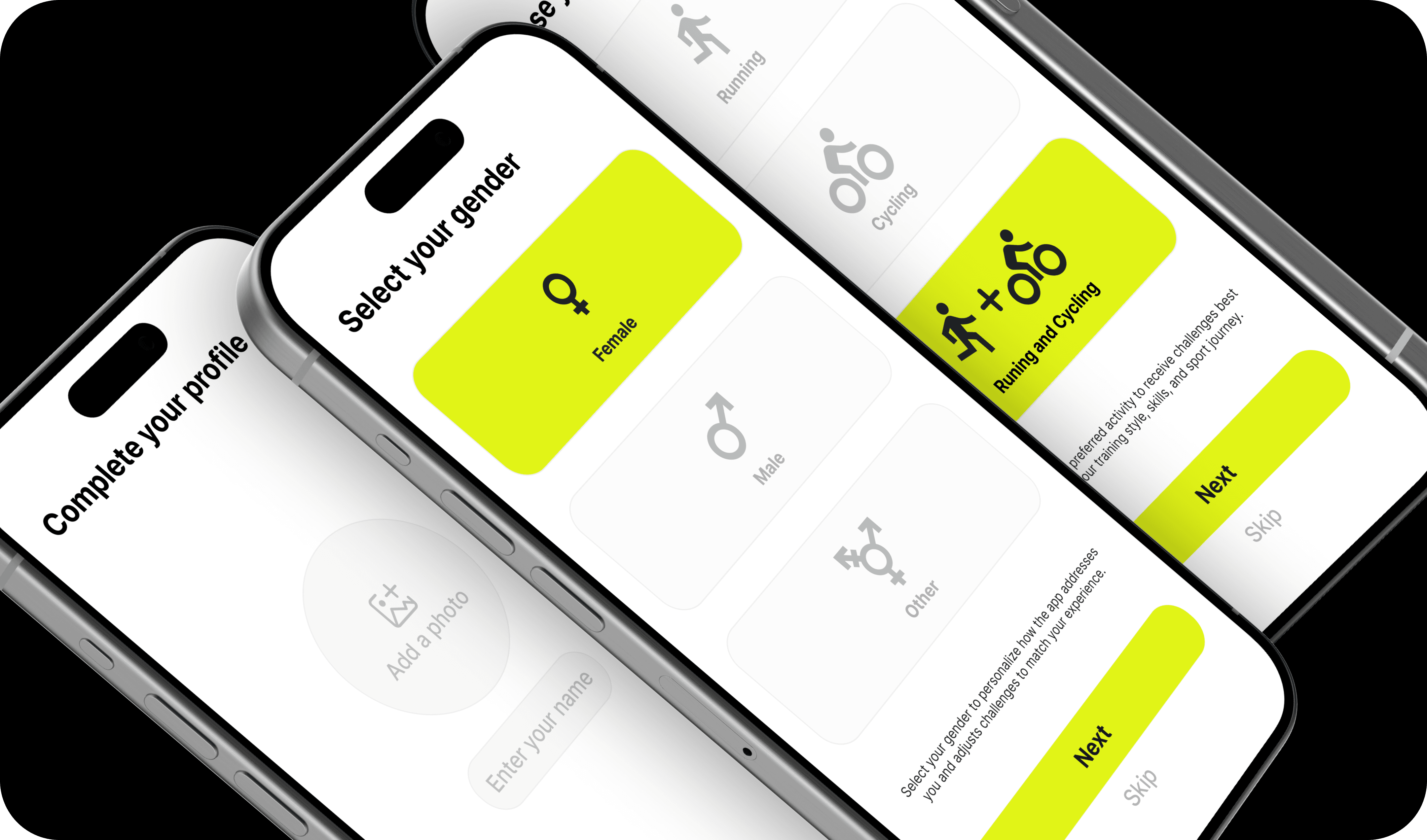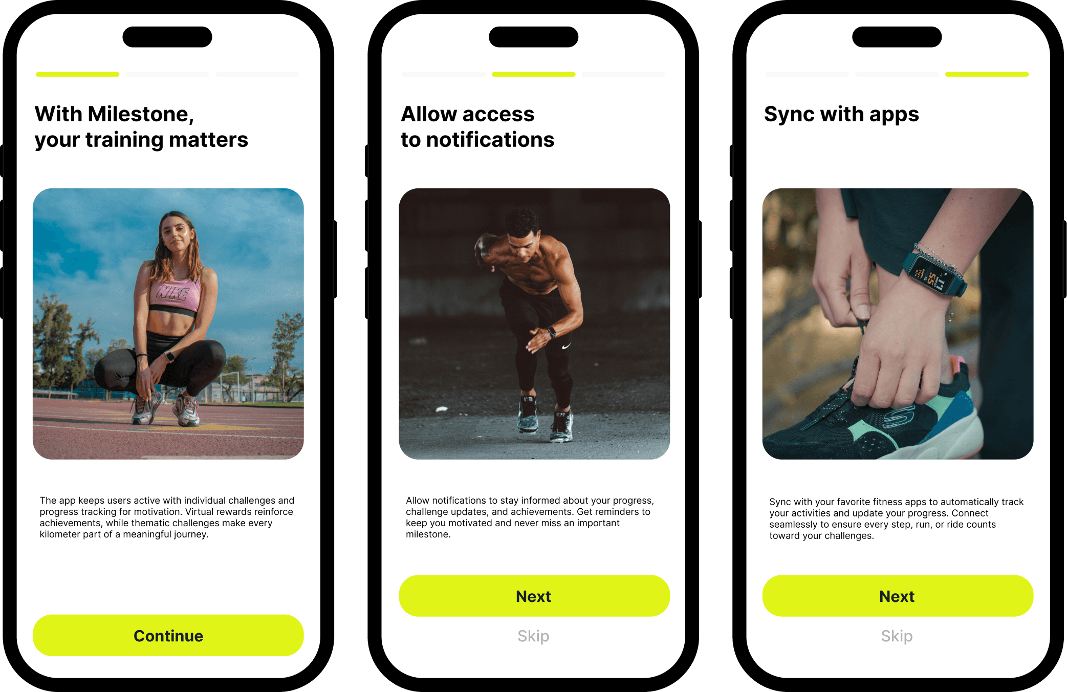 Sekcja została zaprojektowana, aby w prosty i przejrzysty sposób wprowadzić użytkownika w funkcje aplikacji. Pierwszy ekran przedstawia główne sekcje – wyzwania, postępy i społeczność. Kolejny prosi o dostęp do lokalizacji i powiadomień, aby zapewnić pełne śledzenie aktywności. Ostatni umożliwia synchronizację