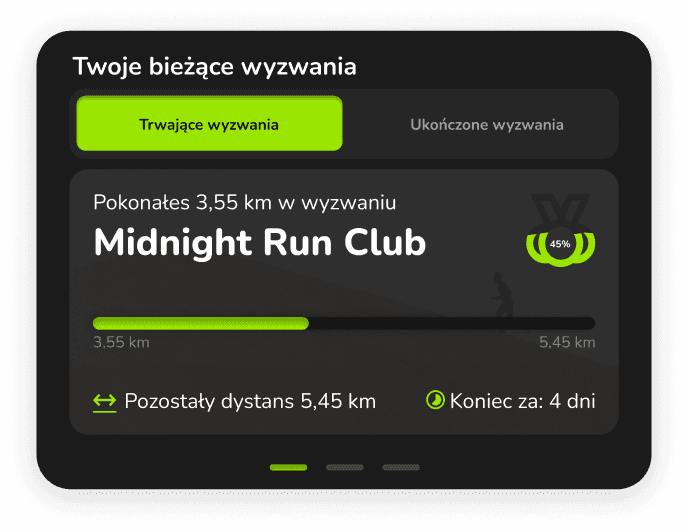 Wskaźnik postępu na ekranie wyzwań umożliwia szybki podgląd aktualnego postępu w wyzwaniu, prezentując kluczowe informacje dla użytkownika, takie jak pozostały dystans do zdobycia medalu. Dodatkowo użytkownik może łatwo przełączyć widok na ukończone wyzwania za pomocą prostego switcha, co ułatwia monitorowanie osiągnięć i motywuje do dalszej aktywności.
