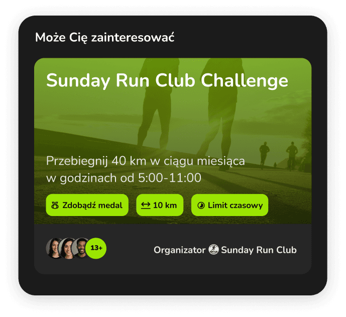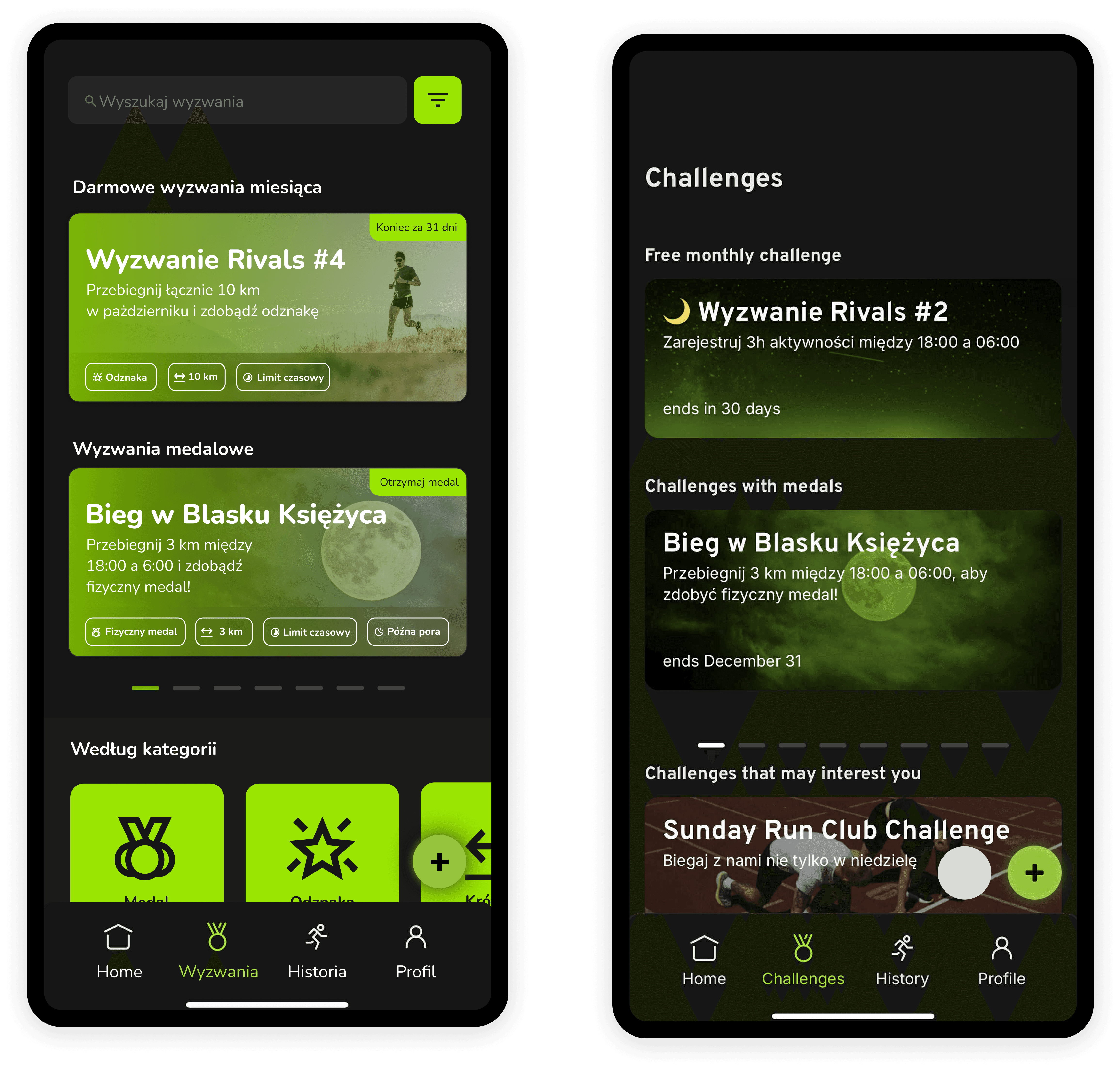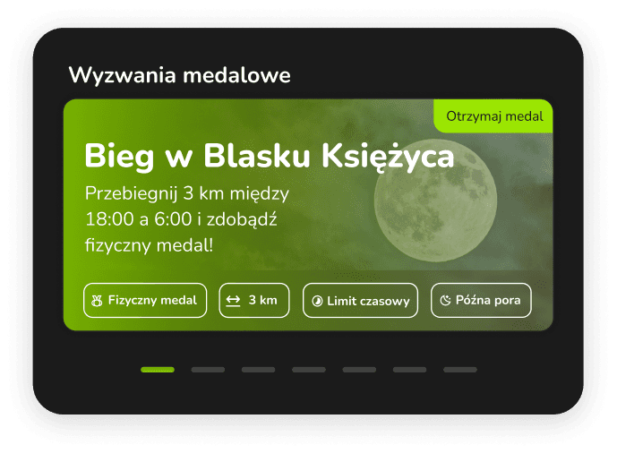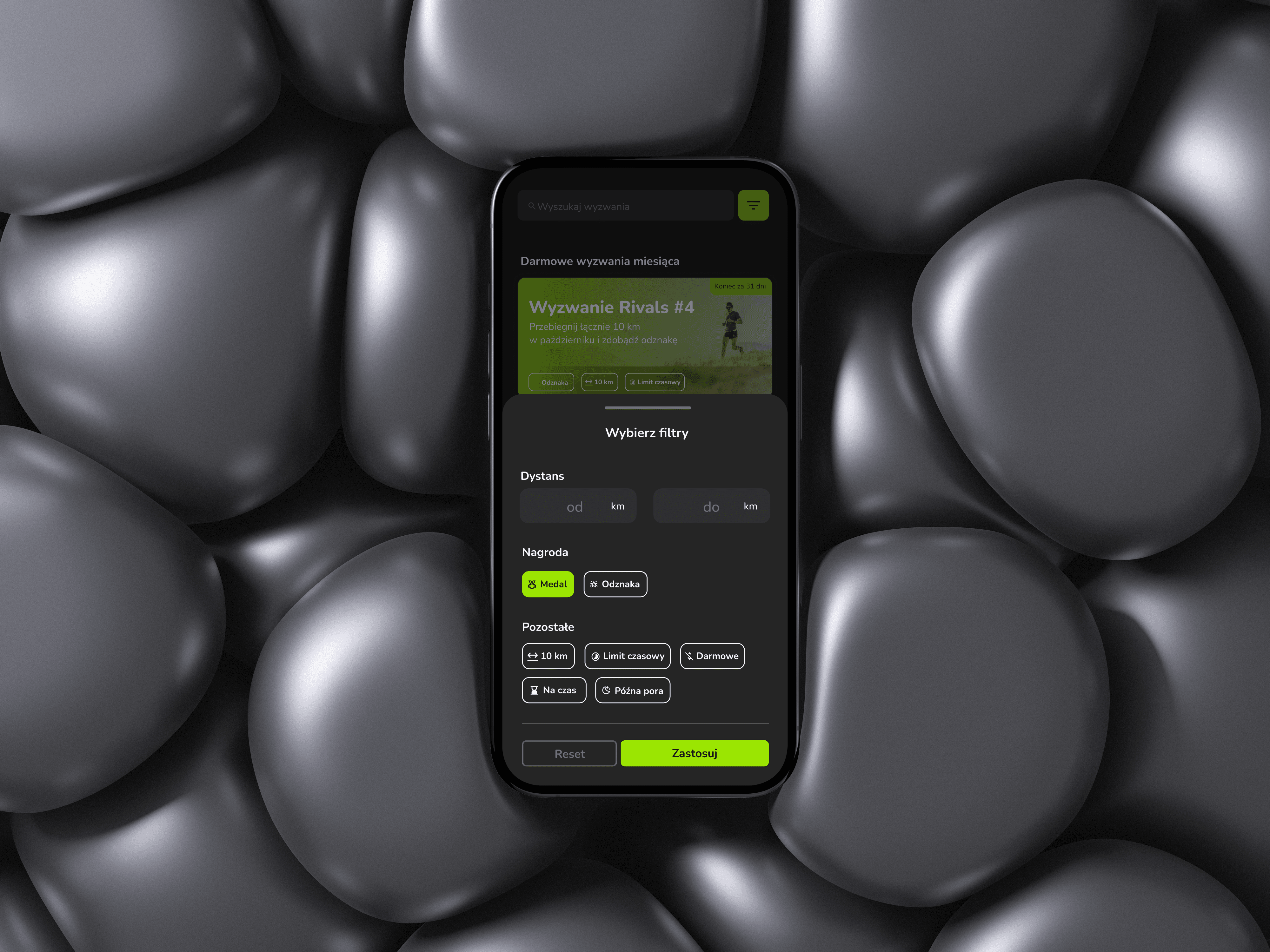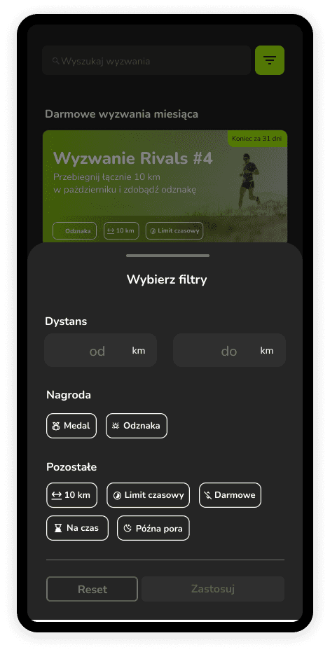 Dzięki systemowi filtracji użytkownicy mogą w prosty sposób wyszukiwać wyzwania biegowe według dystansu oraz rodzaju nagrody – fizycznego medalu lub wirtualnej odznaki. Filtry są powiązane z tagami widocznymi na kafelkach wyzwań, co zapewnia spójny i intuicyjny interfejs. Pozwala to szybko odnaleźć wyzwania dopasowane do indywidualnych potrzeb i preferencji.